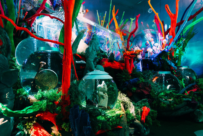蓄光のガラス植物「ウカルクパ」が生い茂る森は、古代遺跡が眠る神秘的な空間。それらを彩る宇宙魚たちが群れを成して泳ぎまわります。【このゾーンで見られるいきもの例】エンゼルフィッシュ