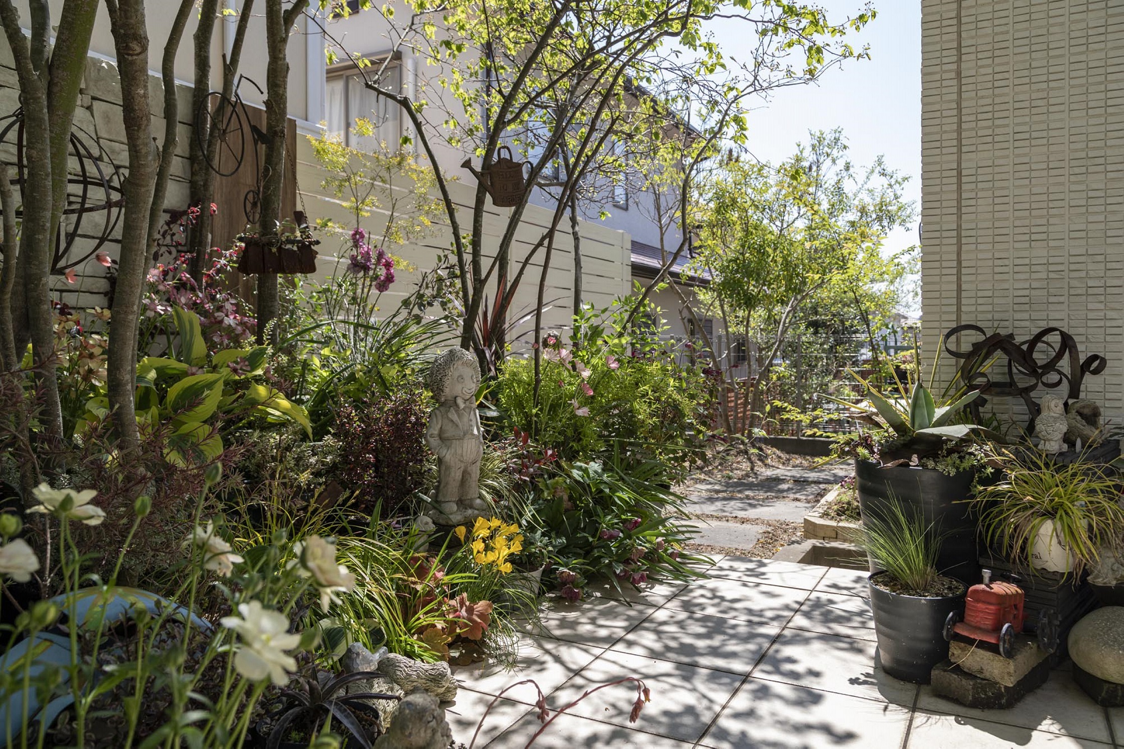 賢幸さんのこだわりは庭で四季を感じられることと、自分が好きだと思える植物を和・洋ジャンルを問わず「うちで育ててみたい!」という直感的な思いで植栽し、楽しむということ。常緑樹は少なく、大半が落葉樹で、落葉した後の枝を見ることや、庭のどこかで年間を通して花が見られるように配置しています。また一年草はあまり取りいれず、多年草で構成しています。お気に入りのオブジェなどを自然に溶け込むように置き、休みの日には、家族で花苗などを買いに行き、植え替えなどをするのも一家の楽しみのひとつです。