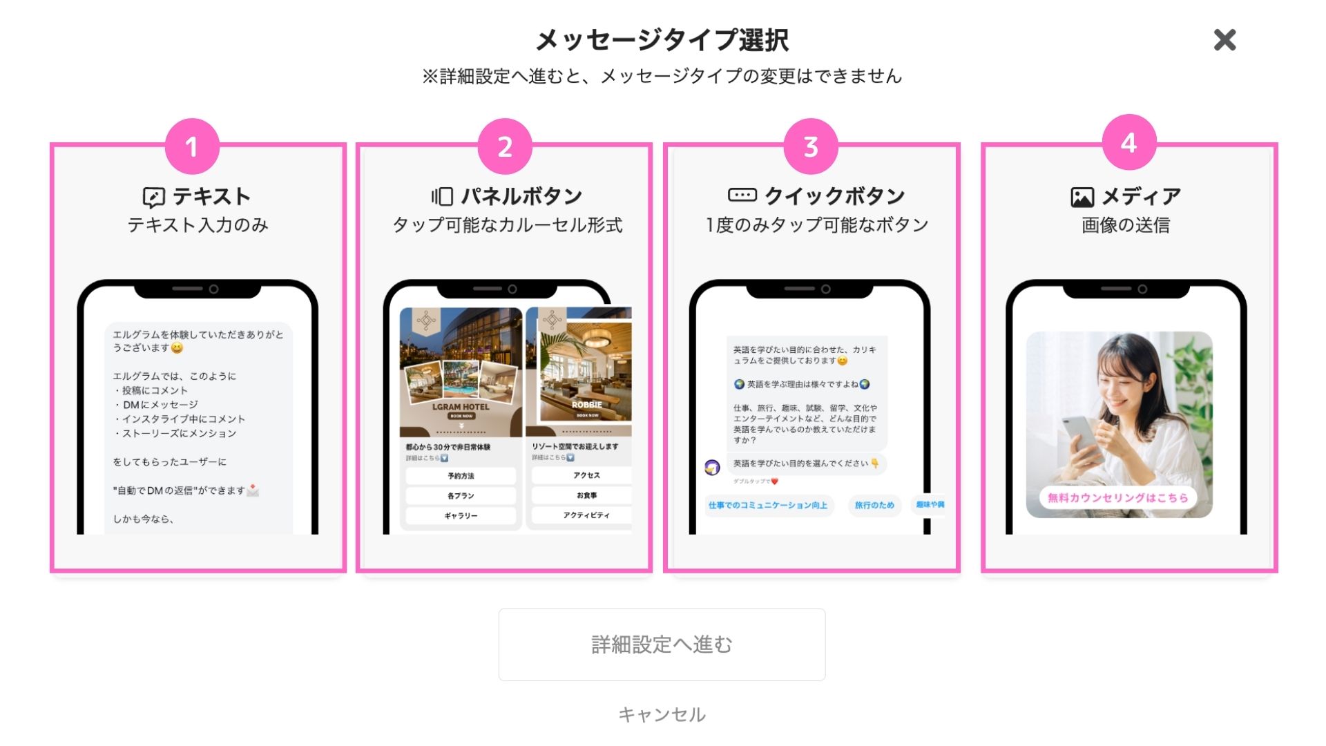 株式会社ミショナが提供するInstagram(インスタ)自動化システム「エルグラム」ではメッセージをテンプレート化できます。 テキスト・パネルボタン・クイックボタン・メディアの4つの形式で作成可能です。