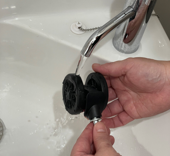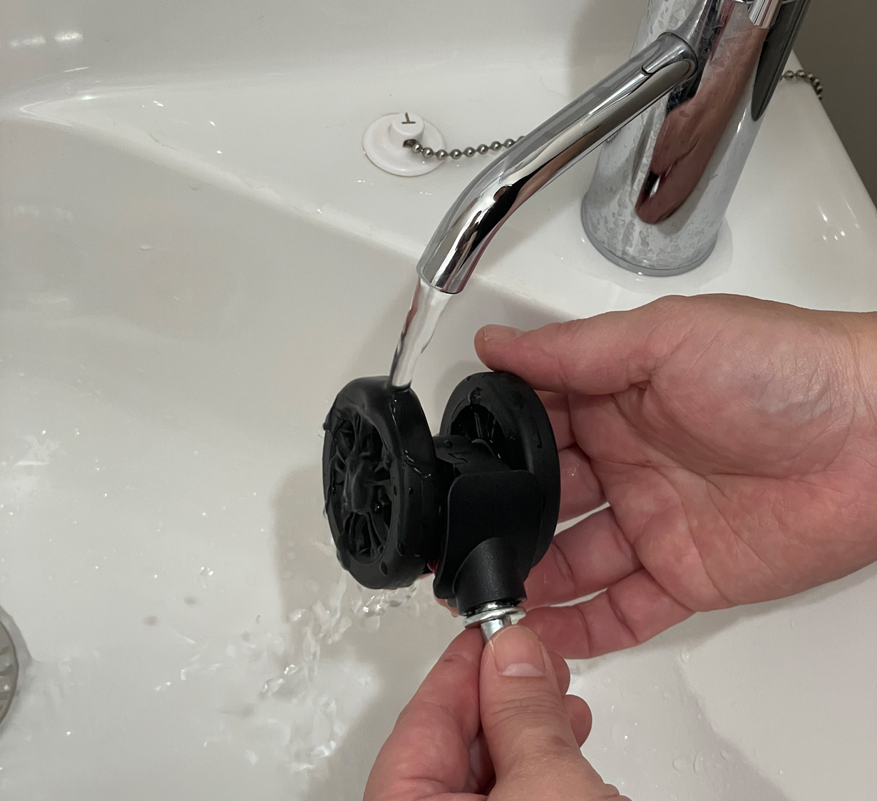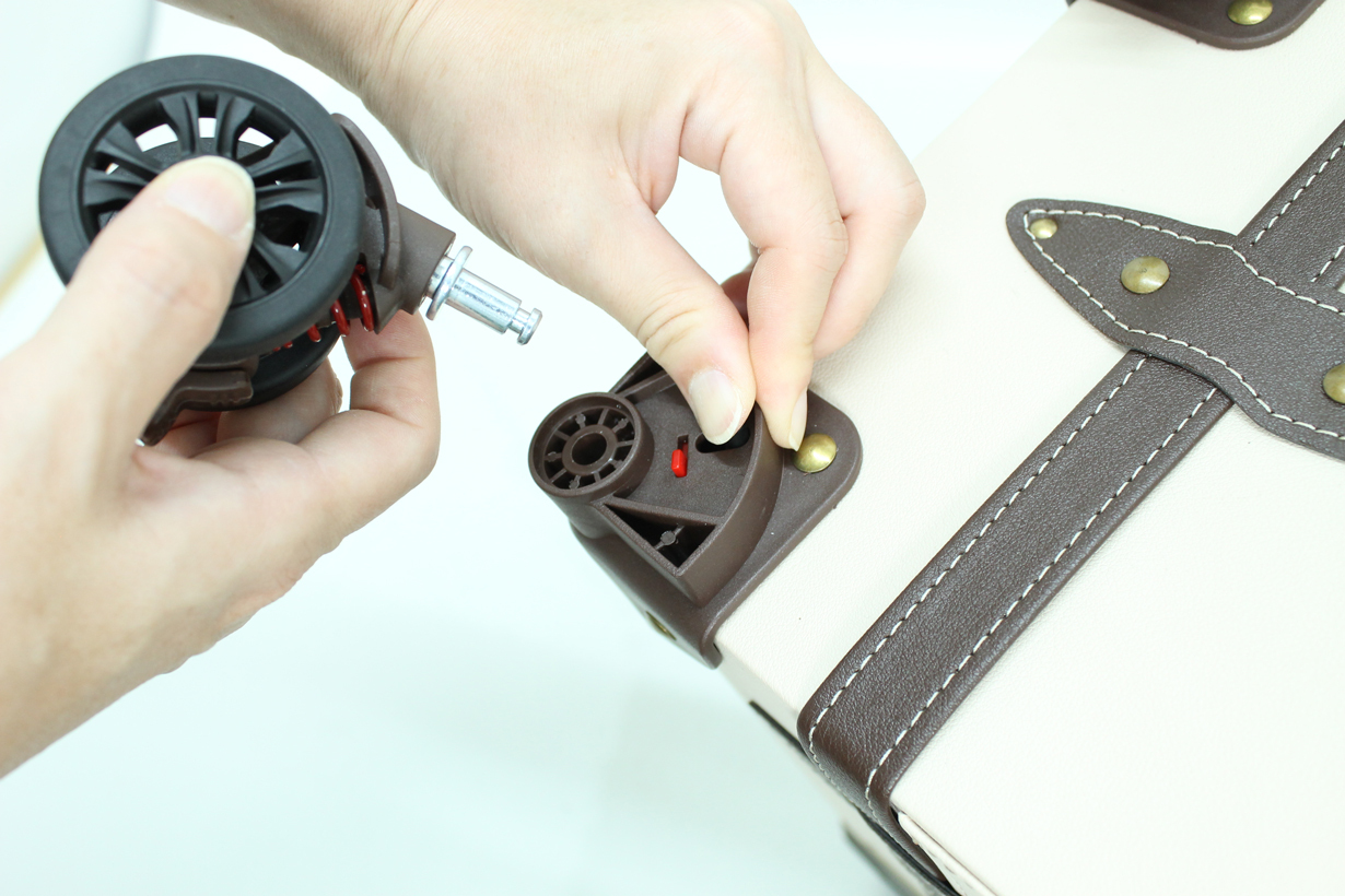 帰宅後にタイヤの汚れを取り外すことで容易に洗浄でき清潔。そして、ケースの修理で一番多いタイヤ部分に対しタイヤ取替え簡単解決。また、タイヤを外すことで機内持込みの最大化をはかった容量29L。