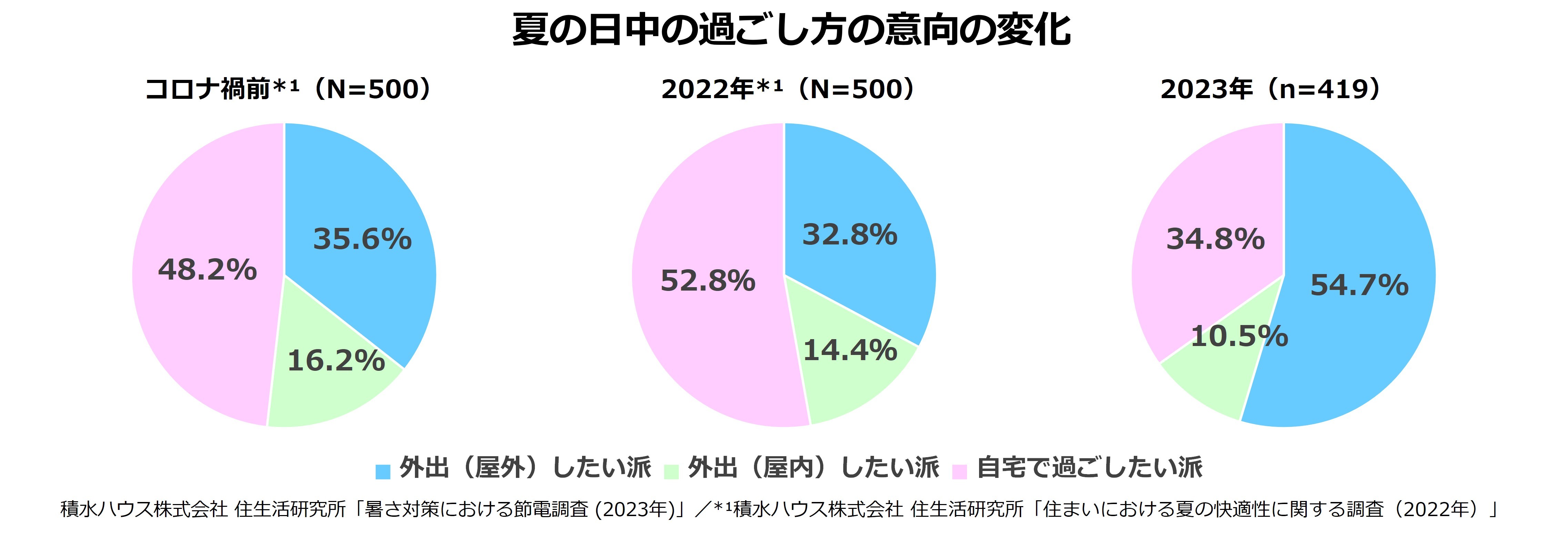 2023年の夏(以降、今年の夏)は、2023年5月より新型コロナウイルス感染症が5類感染症へ移行したことを受け、コロナ禍後の外出制限が求められなくなったこともあり、日中の過ごし方の意向で「外出(屋外)したい派」は54.7%でした。これは、昨年の夏(2022年に実施した「住まいにおける夏の快適性に関する調査」*1より)と比較し20ポイント以上増えました。また、コロナ禍前の意向と比較しても20ポイント近く増える結果となりました。