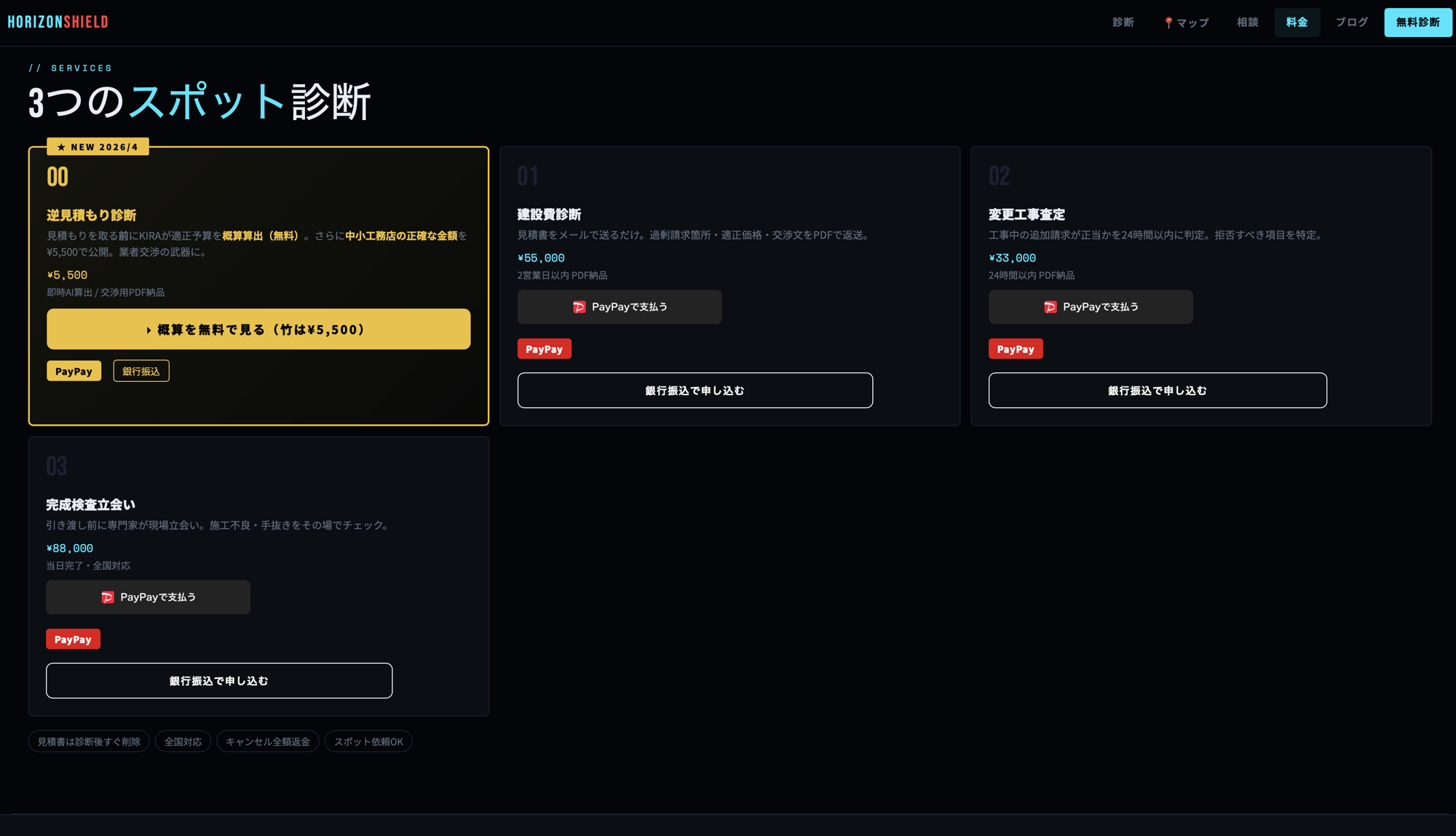 サービス料金逆見積もり診断(概算)無料逆見積もり診断(交渉用PDF)¥5,500(税込)建設費診断¥55,000(税込)変更工事査定¥33,000(税込)完成検査立会い¥88,000(税込)