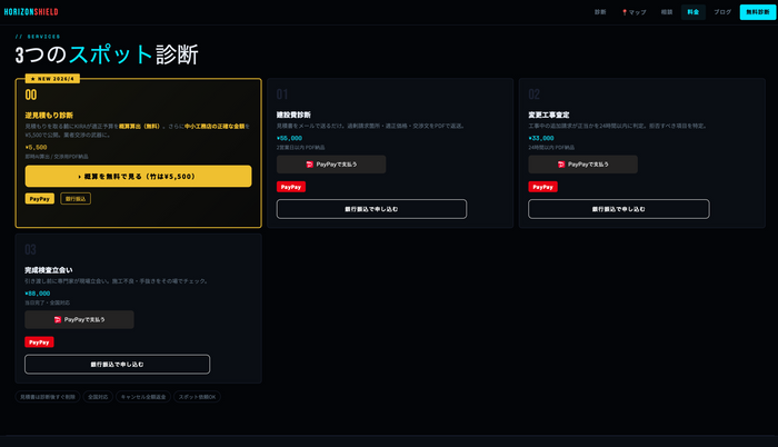 これまでの建設費診断サービスは「業者の見積もりをチェックする」事後対応型でした。HORIZON SHIELDの逆見積もり診断は、業者が来る「前」に適正価格を把握するための事前対応型です。