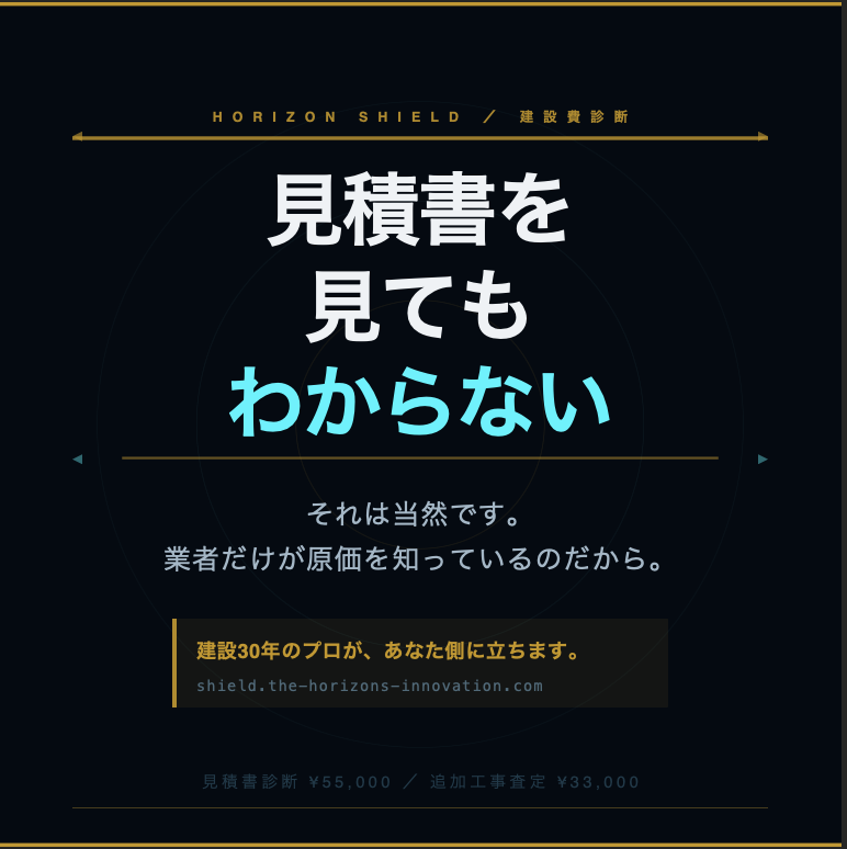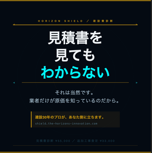 建設費診断サービス「HORIZON SHIELD」を運営するThe HORIZ音s株式会社(所在地:神奈川県平塚市、代表取締役:大賀俊勝)は、2026年4月より新サービス「逆見積もり診断」の提供を開始しました。