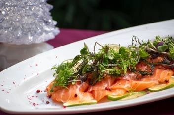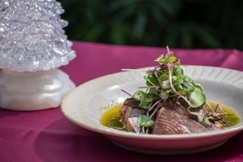 クリスマス限定のサーモンカルパッチョ「ノエル・サーモン・ルージュ」、“和”と“伊”が融合した新感覚のタタキ「カツオ・コン・ヴェルデ 〜香草薫る炙りタタキ〜」、色彩豊かなクリスマスリース仕立てのサラダ「サラダ・ド・ノエル」。