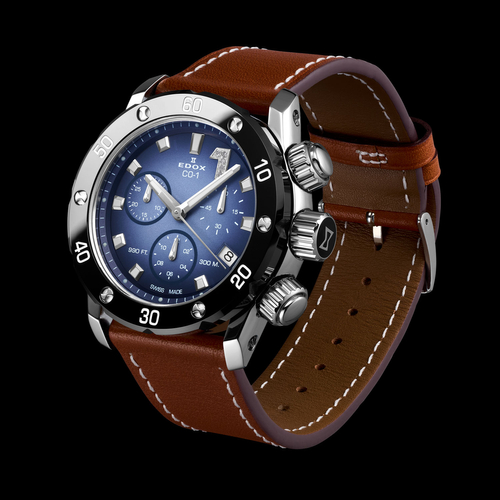 時計本体は、従来のケース直径45mmから38mmに小径化してファッション性・着用感を際立たせた、エドックスのフラッグシップモデル・クロノオフショア1。特殊なケース構造、ねじ込み式リューズ、厚みのあるサファイアクリスタル風防により、30気圧/300m防水性能を備えています。