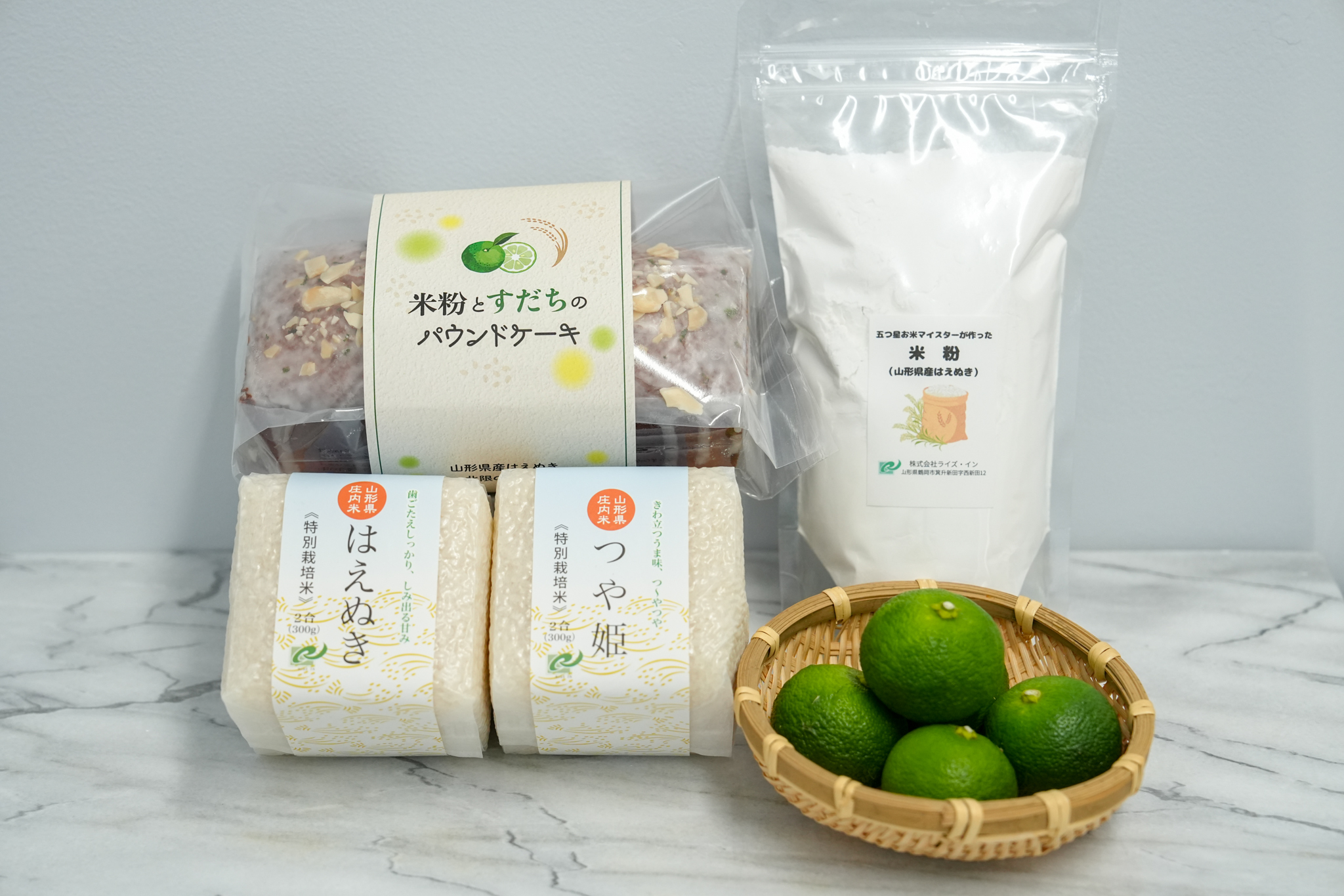 (4)【早期リターン】やまがたセット:米粉とすだちのパウンドケーキ 1本、はえぬき・つや姫2合、米粉300g、北限のすだち100g(4~5個) 5,840円