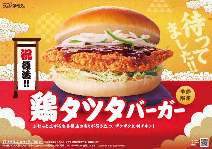 【コメダ珈琲店】\祝 復活!!/ 生姜醤油の香りがより一層引き立つ、ザクザク大判チキンの 「鶏タツタバーガー」が 2025年4月16日(水)より季節限定で販売開始!