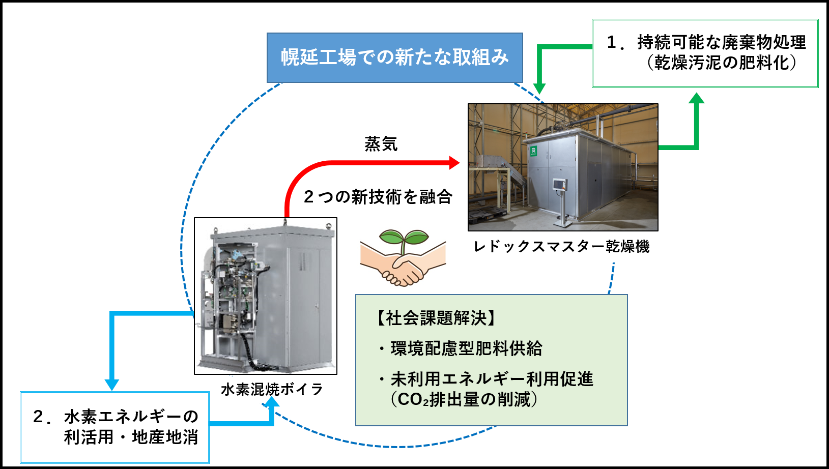 ・水素と既存ボイラ燃料であるLNGを混焼するボイラ設備を新設し、水素利用の技術的な蓄積を図ると共にレドックスマスター乾燥機の主熱源として使用する。