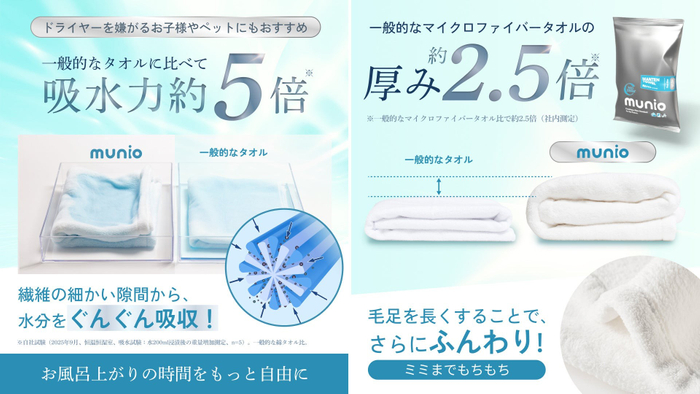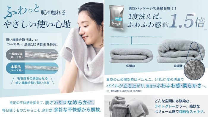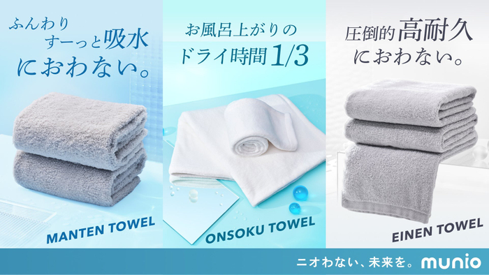 薬剤不使用でニオイ菌を抑制。清潔・速乾・高耐久を叶える、新時代のタオルブランドから機能的なタオル3種類を販売開始いたします。(https://munio.jp/)