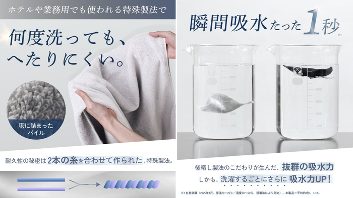 厚手なのに綿タオルの約1/2という軽さで、乾燥時間は一般的なタオルの約1/3。吸水力は約5倍と圧倒的で、髪や肌の水分をすばやく吸い上げ、お風呂上がりのドライ時間を短縮します。表は吸い付くような“もっちり面”、裏はふんわり柔らか面の二重構造で、用途や好みによって使い分けも可能。敏感肌やお子さまにも安心して使え、毎日のバスタイムがもっと快適で軽やかになる1枚です。