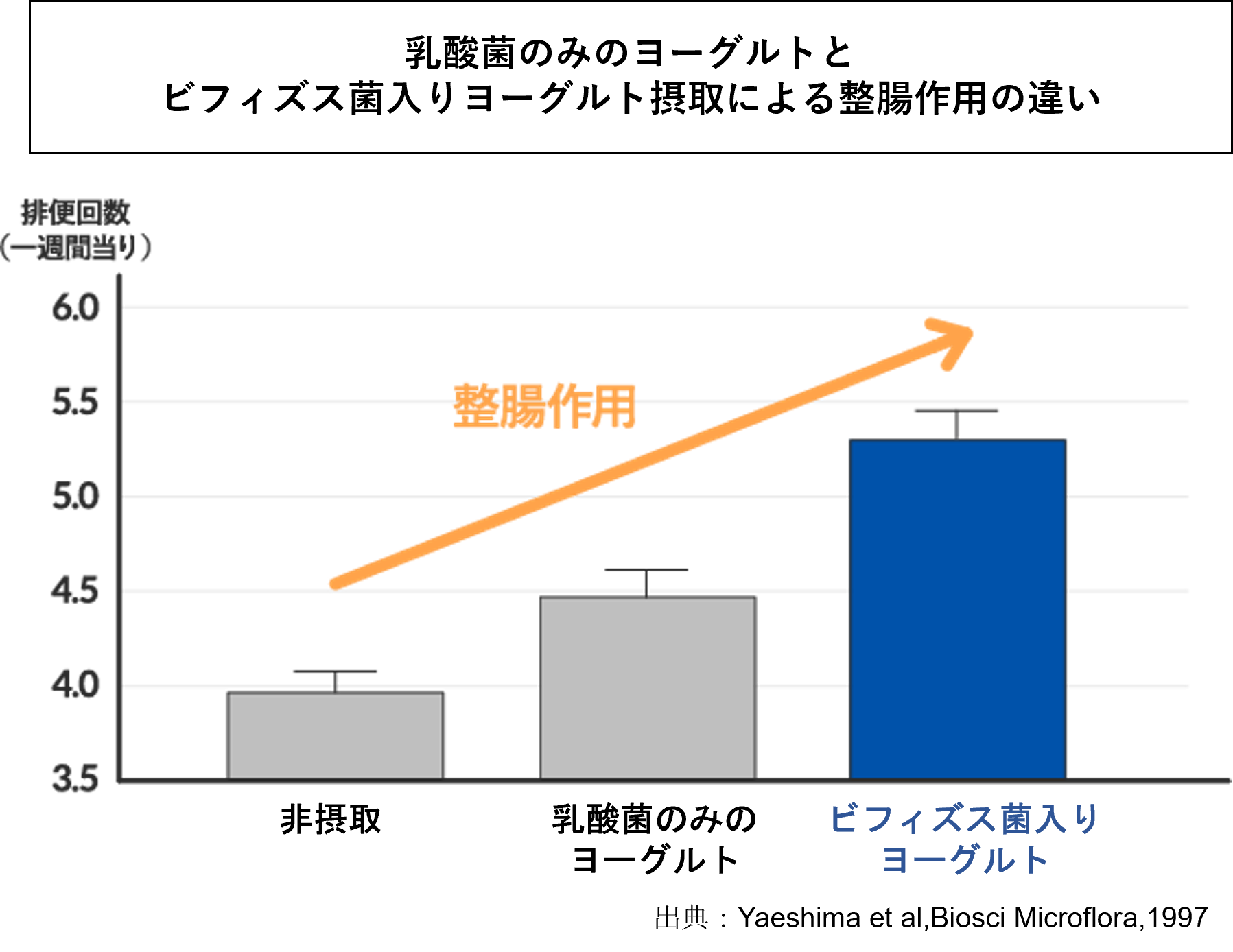 便秘を改善するためにも、日頃から善玉菌の代表であるビフィズス菌が入ったヨーグルトを積極的に取り入れてみてください(ヨーグルトの中にはビフィズス菌が入っていないものも意外と多いです)。実際に便秘気味の女性にビフィズス菌入りヨーグルトを食べてもらった結果、排便回数が大きく上昇しました。これは2週間続けて食べた結果ですので、まずは2週間チャレンジしてみて、自分のお腹に合うか確認してみるのがよいと思います。