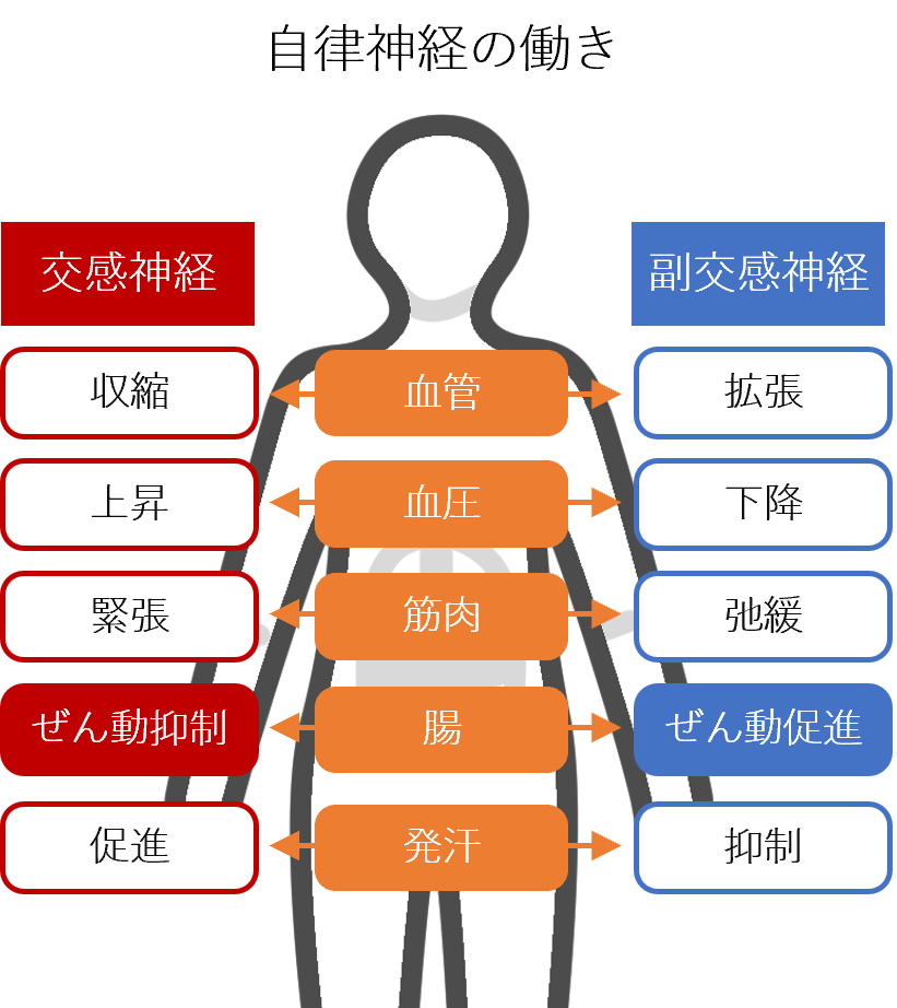 便の排出を担う大腸は自律神経の影響を受けやすい器官です。緊張やストレスなどで自律神経のバランスが乱れて交感神経が活発になると、腸の働きが低下して便秘になりやすくなります。自律神経は、気候や気温の変化にも敏感であり、季節の変わり目は特に気を付ける必要があります。