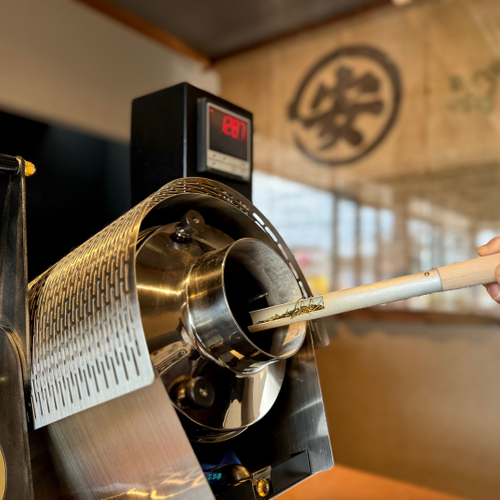 実は甲賀市は日本五大銘茶を生み出したお茶の名産地です。そのお茶を使って茶師でもある五代目店主が「焙煎出来立てのほうじ茶を飲んでほしい。焙煎体験をして欲しい。」という思いで焙煎所が始まりました。2022年には甲賀市土山では「土山一晩ほうじ茶」という地域ブランドが立ち上がったこともあるほど、ほうじ茶には適した産地。そんな産地だからこそ、製造元のお茶屋さんだからできるサービスです。