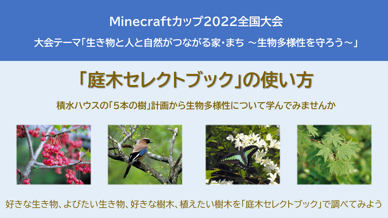 積水ハウスの住宅展示場等で、教育版マインクラフトでの家づくりヒントにつながる冊子を無料配布します。積水ハウスの生物多様性の取り組み「5本の樹」計画や住宅の最新技術など、大会のヒントが詰まった1冊です。