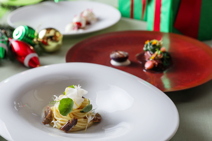 フレンチレストラン「グラマシースイート」では「フランスのホワイトクリスマス」がテーマ。オマール海老を使った冷前菜やフォアグラのポアレなど王道のフレンチ料理をお楽しみいただけます。