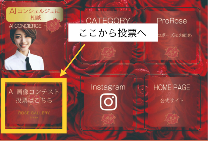 ROSEG ALLERY銀座店のLINE公式アカウントのリッチメニューにある「AI画像コンテスト投票はこちら」のボタンから入り、最も良いと思った作品画像をお選びください。