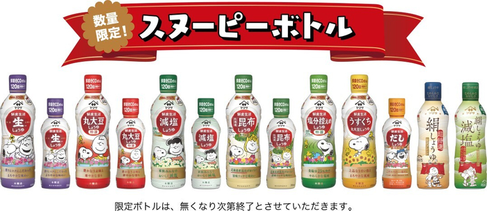 この「鮮度ecoボトル」で、スヌーピーたちの笑顔があふれるデザインボトルしょうゆ13種類を数量限定販売いたします。