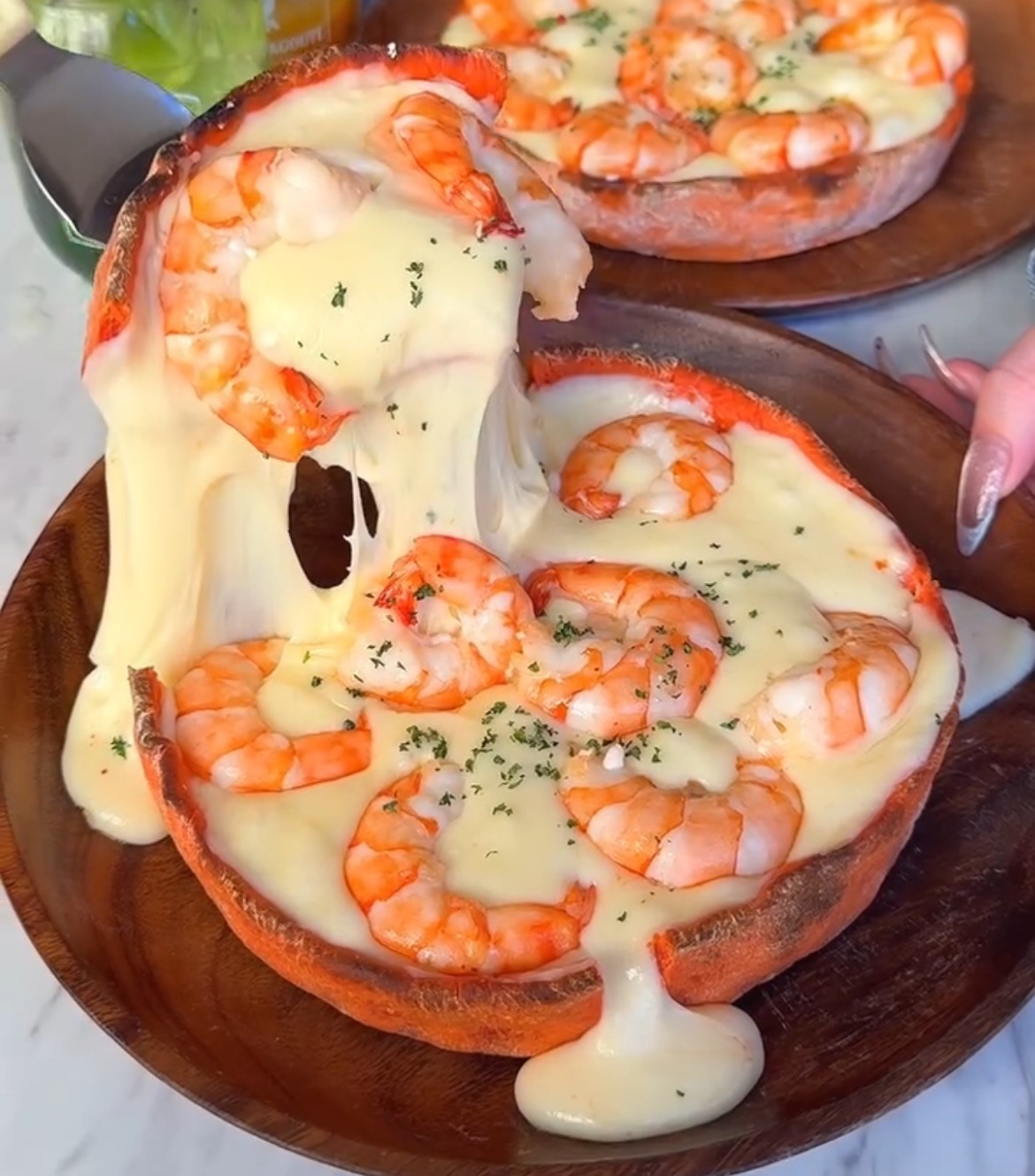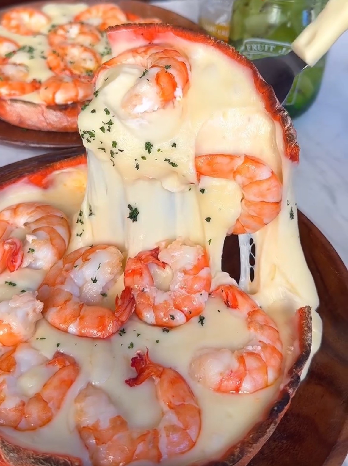 焼き上がったピザの表面には大ぶりの海老が並び、テーブルに運ばれた瞬間から存在感を放ちます。チーズをたっぷり使用した厚みのあるシカゴピザに海老の赤色が加わることで、食卓を華やかに彩る一皿に仕上がりました。