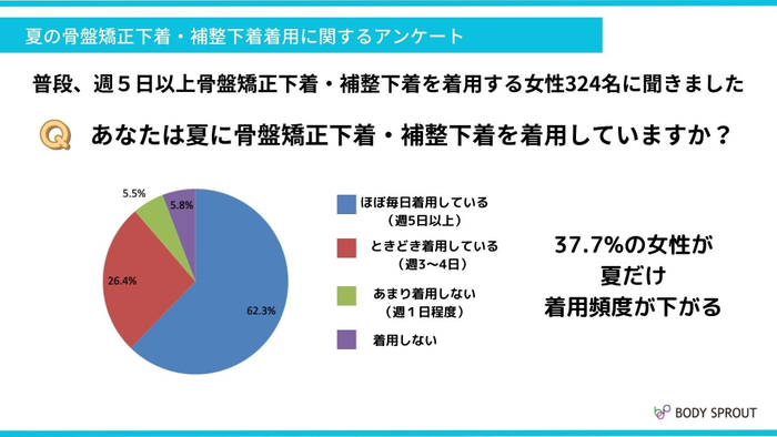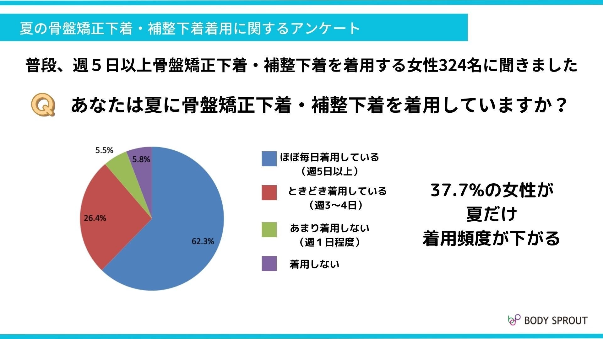 株式会社ボディスプラウトが実施した調査(※)では、夏に骨盤矯正下着の着用頻度が下がる女性は約4割(37%)。