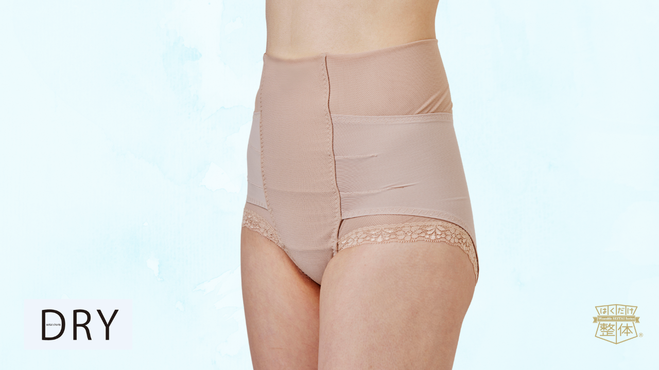 「整体ショーツDRY」は、夏の骨盤矯正下着着用時に多い「汗でベタつく」「蒸れる」といったお悩みを、「吸汗機能」「速乾機能」を搭載した通気性の良いメッシュ生地の採用によって、解決した商品です。