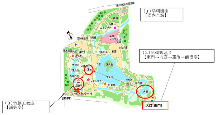 【内容】東門から入園し、まずは内庭でスイレンをご覧いただきます。その後、蓮池に移動してハスを観賞し、涵徳亭で専門家による講義とハスを使った茶菓をお楽しみいただきます。