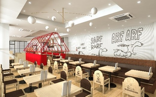 店内に入るとまず目に飛び込む大きなドッグハウスは、まさにCafeのシンボル。壁いっぱいに描かれた、'50、'60、'70年代の四足歩行のスヌーピーの大きなタイルアートが迎えてくれます。すべての椅子の背面には、PEANUTSに登場するキャラクターがデザインされ、ガラス窓越しにカフェの外からも、キャラクターが勢ぞろいしている様子をご覧いただけます。