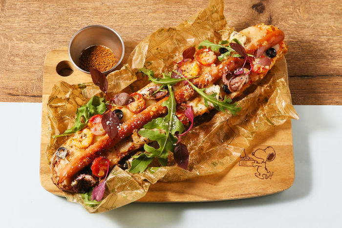 スヌーピーのマイボードのように長くてインパクトのあるピザトースト。カリカリのバゲットの上には約40cmのロングソーセージ、エビやタコ、イカなどのシーフードも具沢山。ワイプアウトのあとはお得意の犬かきで次の波をゲット!?スヌーピーもお腹いっぱいになるような満足感のある一品です。