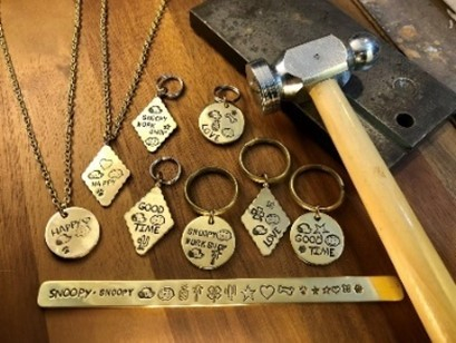 ブラス(真鍮)というゴールドカラーのメタルへ、厳選された刻印を打刻し、「ネックレス・キーリング・ペットタグ」などのオリジナルチャームを作るワークショップです。
