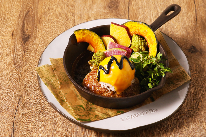 ピッチャーマウンドの上に寝そべるチャーリー・ブラウンをイメージして、ハンバーグの上にはとろ~りチーズと彼のトレードマークのジグザグ模様。熱々のスキレットの中には、かぼちゃ、紅芯大根、さつまいも、芽キャベツ、ロマネスコカリフラワーと彩り野菜がいっぱい。これを食べて次の試合も頑張ってほしい、ボリューム満点のスキレットハンバーグです。香ばしいオニオンステーキソースでお召し上がりください。