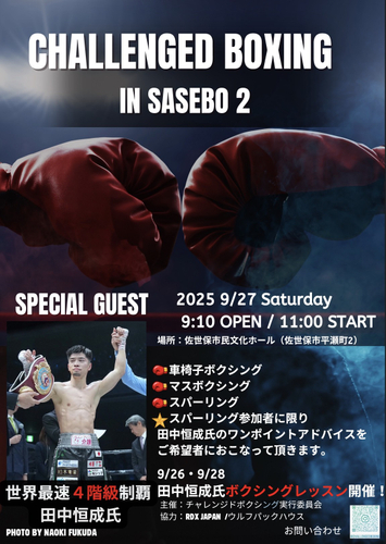 長崎県佐世保市で開催される注目の格闘技イベント「CHALLENGED BOXING IN SASEBO」は、車いすボクシングをはじめ、ボクシングレッスンなど、誰もが楽しめる多彩なプログラムが予定されています。本イベントの目玉は、元WBO世界フライ級スーパー王者で世界最速4階級制覇を成し遂げた田中恒成さんによるスペシャルボクシングレッスンとなっており、注目を集めています。このように障がいの有無を問わず、すべての参加者がボクシングの魅力を体感できる場となっており、スポーツを通じた共生社会の実現を目指しています。