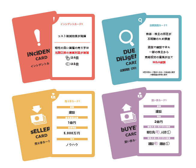 M&A戦国時代には、「売り手カード」「買い手カード」「インシデントカード」「企業調査カード」の4種類のカードがあり、企業が合併や買収を通じて直面する重大な問題やイベントが記されています。現実のM&Aと同じように、財務上の問題や技術的な問題が含まれ、その後の利益にも大きな影響を与えていきます。