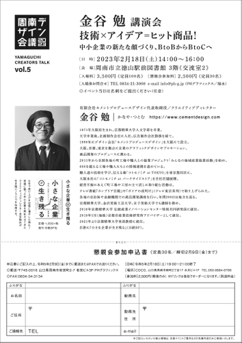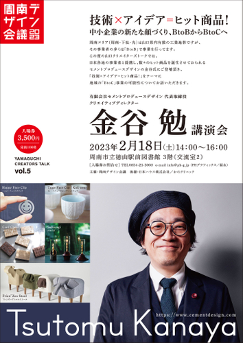 山口県周南市は、県内有数の工業地帯で多くの町工場を有するが、その事業の多くは「B to B(企業間取引)」であります。この度「B to C(企業消費者間取引)」による地場の強みを活かした企業復活劇のプロデュースで全国的に注目されているクリエイティブデザイナー金谷勉氏を招聘し、地域事業に潜在する可能性について考える講演会を、周南デザイン会議主催(周南市後援)で2023年2月18日(土)に周南市立徳山駅前図書館にて行います。