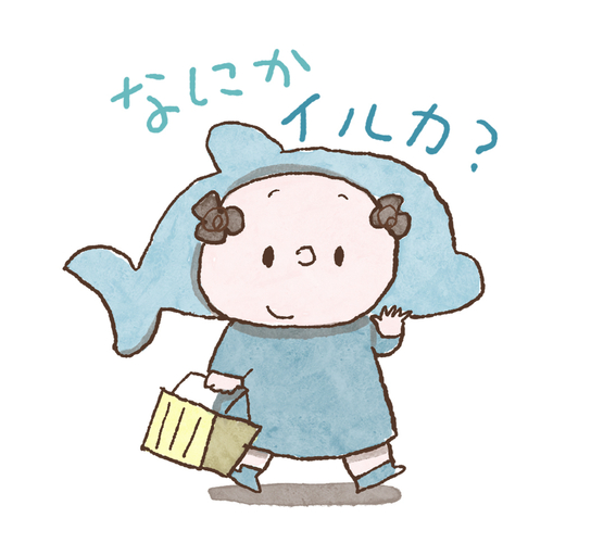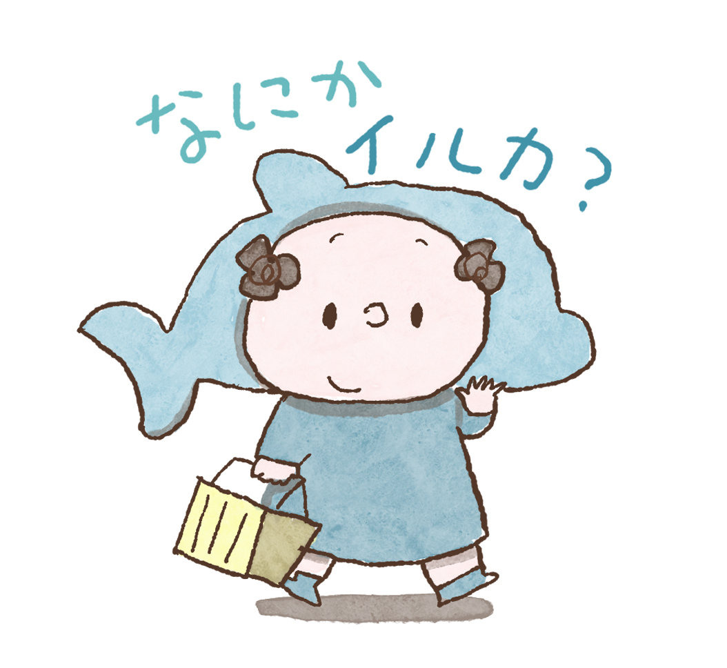 イルカの被り物で「なにかイルカ?」と買い物が必要か聞く