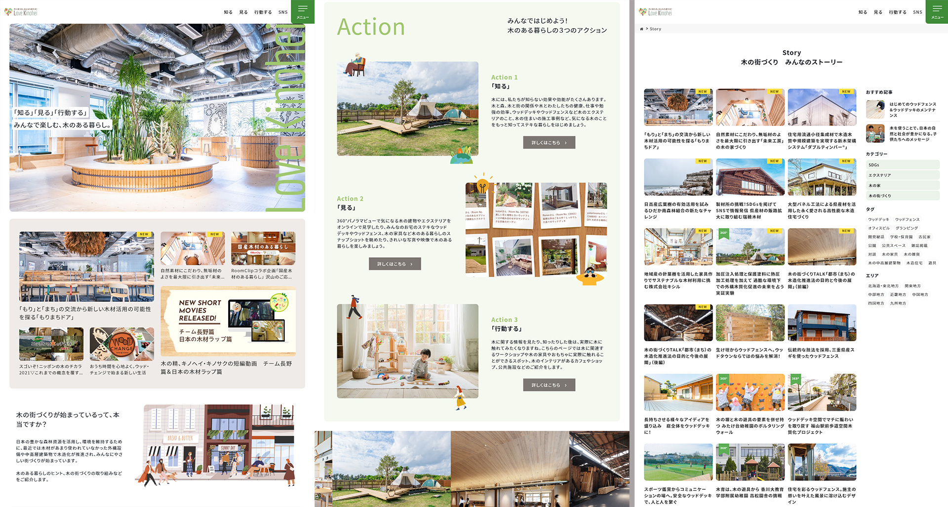 全国の木材業、木材加工業および木材販売業者が組織する協同組合およびその連合会を会員とする全国木材協同組合連合会(略称:全木協連/会長:松原 正和)は、国産材の需要拡大を目的とし、“木のある暮らし・木の街づくり”を提案する「Love Kinohei(ラブキノヘイ)」(WEB/SNS)を、一般社団法人 全国木材組合連合会とともに2019年から運営しています。4年目となる今年、イラストを使ってより親しみのあるデザイン・構成に一新しました。これまで、追加された様々なコンテンツを「知る」「見る」「行動する」の3アクションに分類、さらにメインコンテンツである「Story木の街づくりみんなのストーリー」では、カテゴリー・タグ・エリアで記事を絞りこめる機能を付加し、興味のある記事にアクセスしやすくなりました。