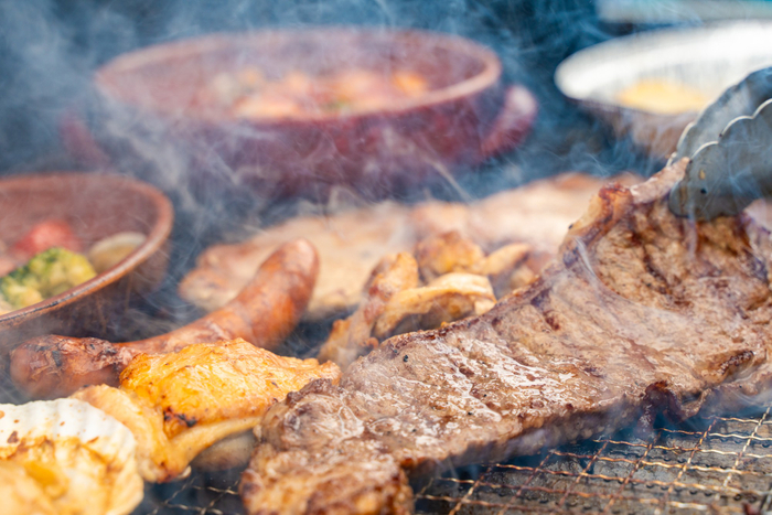 BBQ付きプランでは、淡路牛・淡路島ポーク・淡路鶏がそろった本格バーベキュー。副菜には、淡路島産シラスのアヒージョ、淡路島粗挽きポークウィンナーなど、島の食材を使った一品も並びます。