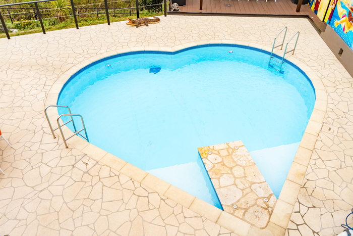 ハート型のプールサイドで、ドリンク片手に水面を眺めながらおしゃべりをする。ここは、グランピングリゾート Awajiに泊まる人だけが入れる、特別なプールです。