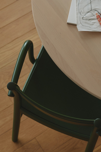イタリア語で“小さな食堂”を意味する「CANTINETTA」シリーズは、現代日本のダイニング空間が和と洋の要素が調和した独自のスタイルへと進化しているという武内の考察に基づき、空間に主張しすぎることなく溶け込むニュートラルなデザインを追求して開発されました。デザインの原点となったのは、 2015年に廃番となるも今なおカリモク家具の工場の食堂で実際に使われているチェア「CS1105」。その力強く安心感のある太めのシルエットや、シンプルながらも愛らしいデザインからインスピレーションを得て、現代の住環境に調和するよう再構築されました。幅広い空間でお使いいただけるように、チェアはアーム付き、アームレスの2種、座面は張座、板座、ペーパーコードの3種からお選びいただけます。また、テーブルは4つのサイズバリエーションに加え、Φ1100mmの円卓もラインナップ。塗装色は当社のブナ材塗装色オーダーのラインナップに加え、昨年発表した「コットンナチュラル」、また武内と新規で開発した「カンティネッタグリーン」の2色にも対応します。