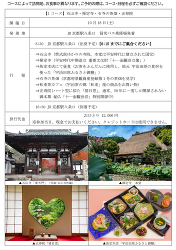 京都バス株式会社(本社:京都市右京区 代表取締役社長:吉本直樹)では、お茶の京都DMOに協賛いただき、南山城の古寺・由緒あるお寺を案内付で拝観する「お茶の京都」プレミアムバスツアーの販売を9月2日(火)より開始します。本年は全3コースの設定をおこない、開催日は【1コース】10月18日(土)、【2コース】10月26日(日)、11月3日(月・祝)、【3コース】11月2日(日)、11月29日(土)の計5日間です。