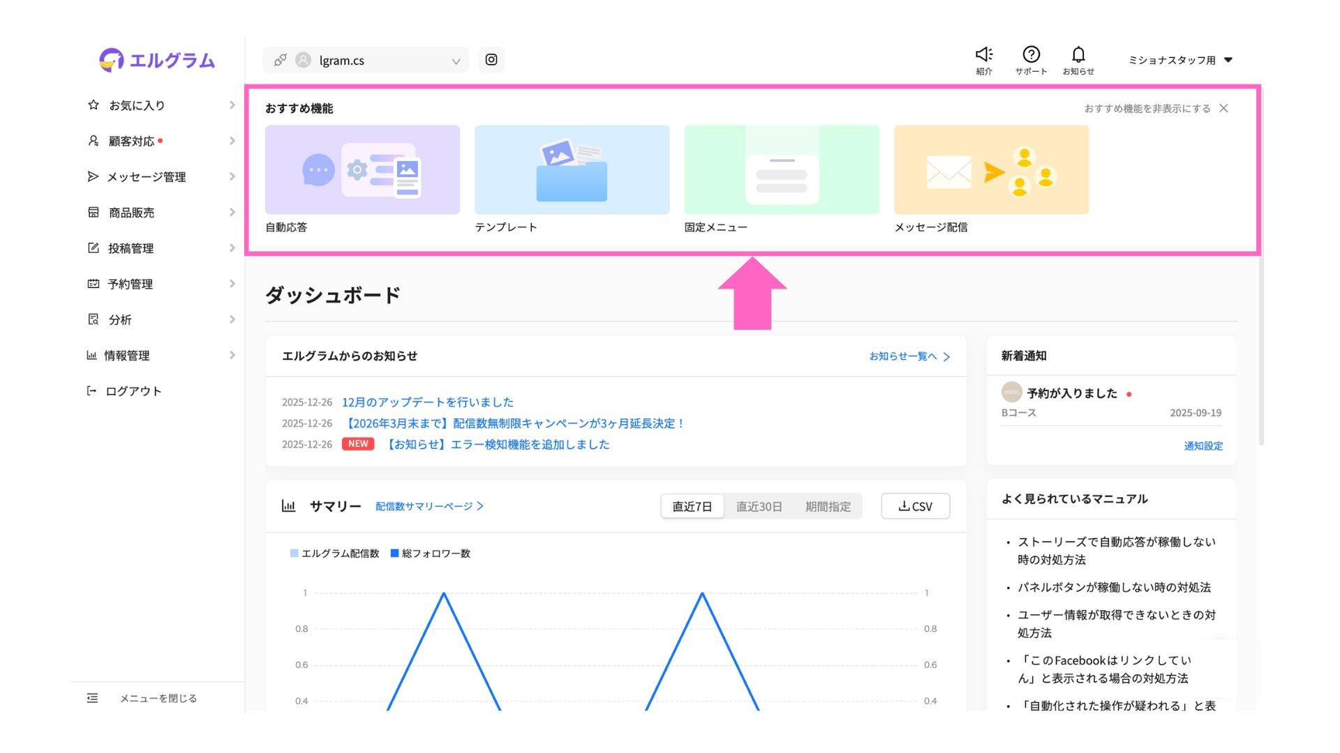 株式会社ミショナ(本社:福岡県福岡市、代表:鈴木隆宏)は、2026年1月29日(木)にエルグラムのアップデートを実施し、TOP画面から「おすすめ機能」を一覧で確認できるようになりました。これにより、よく使う機能が分かりやすくなり、機能探しの手間を減らすことが可能です。