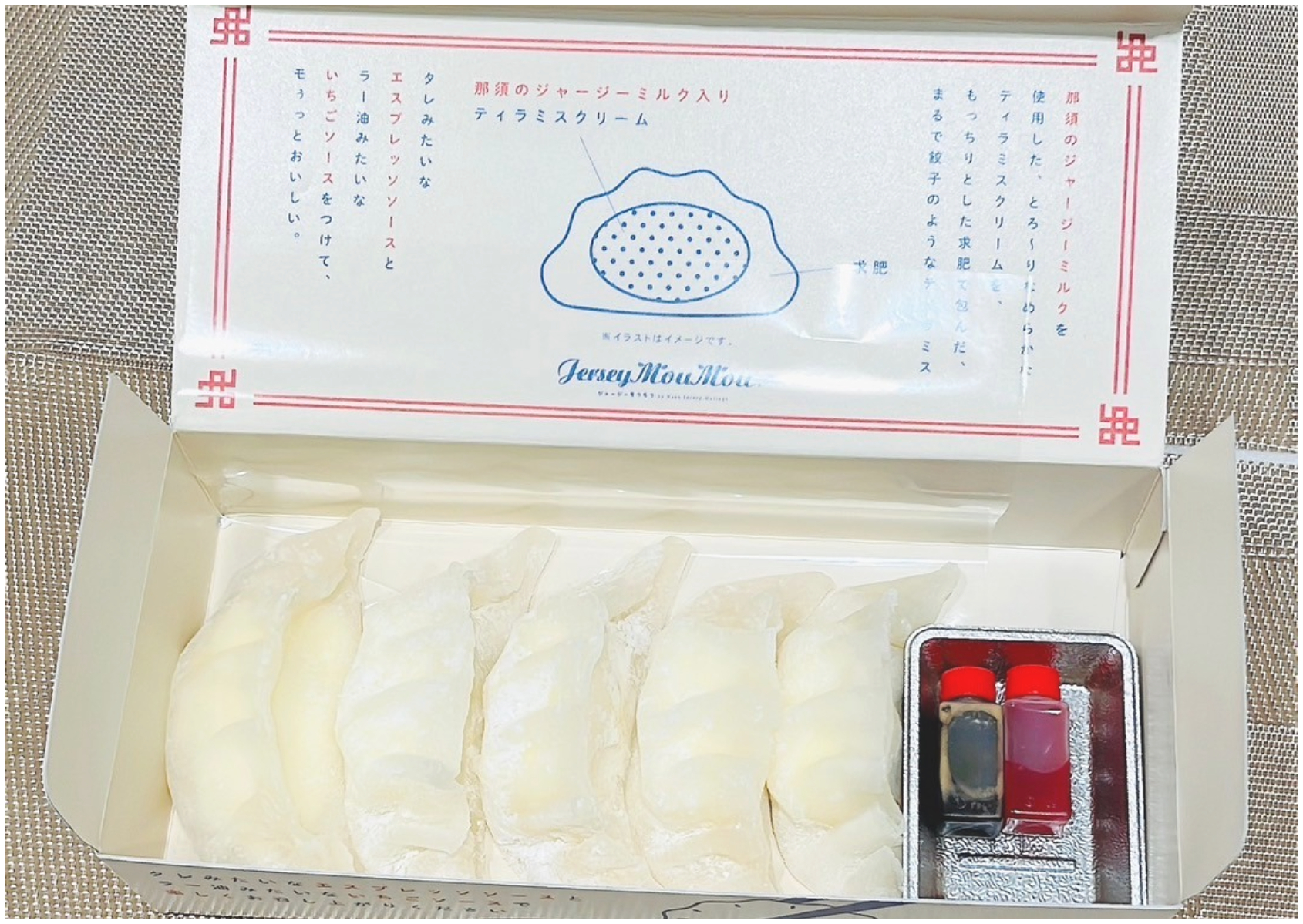 餃子の皮に見立てたもっちりとした求肥で、那須ジャージーミルクを使用したミルクティラミスクリームを優しく包み込みました。ひとくち食べると「モぅ、デリシャス。」と言いたくなるような、新しいミルクスイーツです。