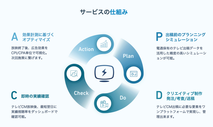 テレシーは、電通が保有する日本最大級のTVCMに関わるアセットをフル活用し、AIを用いた高精度なシミュレーション・最適化・レポーティングを実現する次世代型テレビマーケティングプラットフォームです。配信実績も独自のレポーティングツールである「テレシーアナリティクス」により、最短で広告掲載翌日には把握することができ、シミュレーションデータと比較しながら、AIによるチューニングでさらなる最適化を図ることも可能です。
