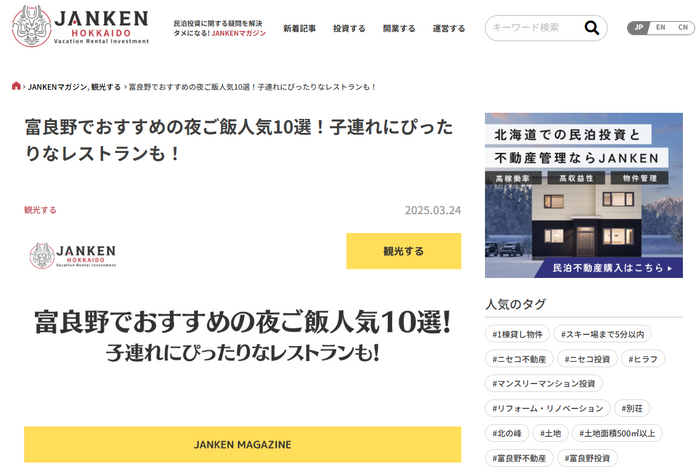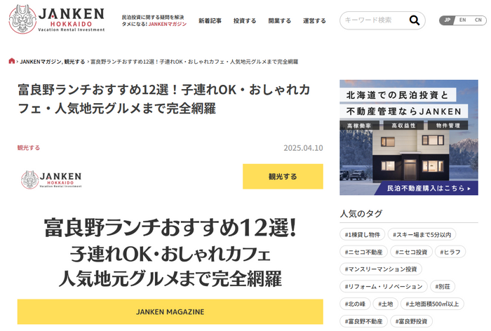 JANKENのWebサイトでは、「JANKENマガジン」という名で、日・英・中の3か国語対応のWebメディアを展開しています。ニッチで専門的な知識を紹介する北海道の民泊投資に関する記事から、一般的で幅広い需要に対応した観光に関するWeb記事まで、その掲載内容は多彩。特に観光系記事は、オーガニック検索によるJANKENへの流入に大きく貢献しています。