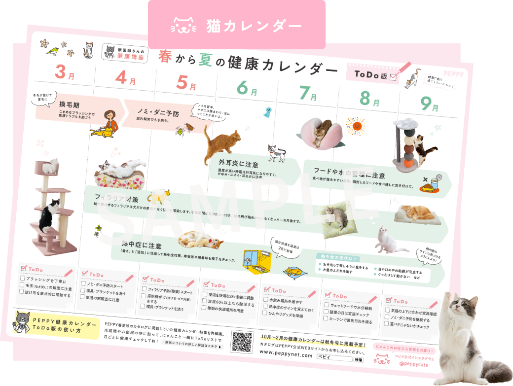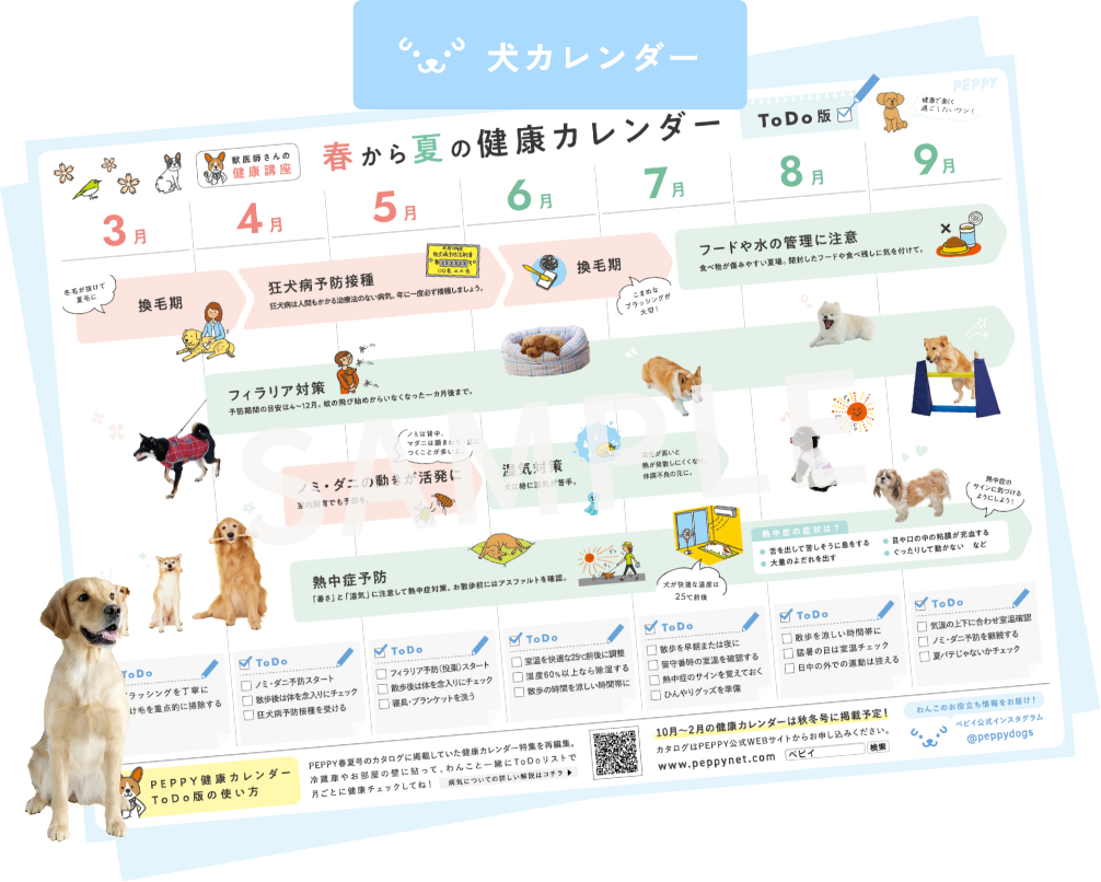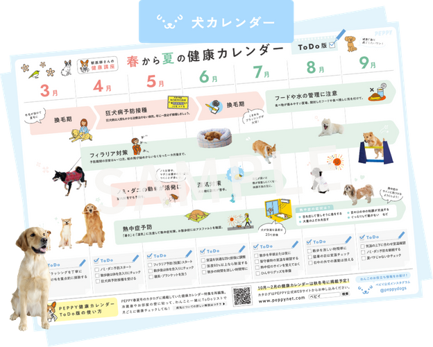 本カレンダーは、季節ごとの健康ポイントがひと目で分かるほか、ToDoリストで日々の健康チェックにも役立つ“飼い主さんのための健康管理サポート”ツールです。