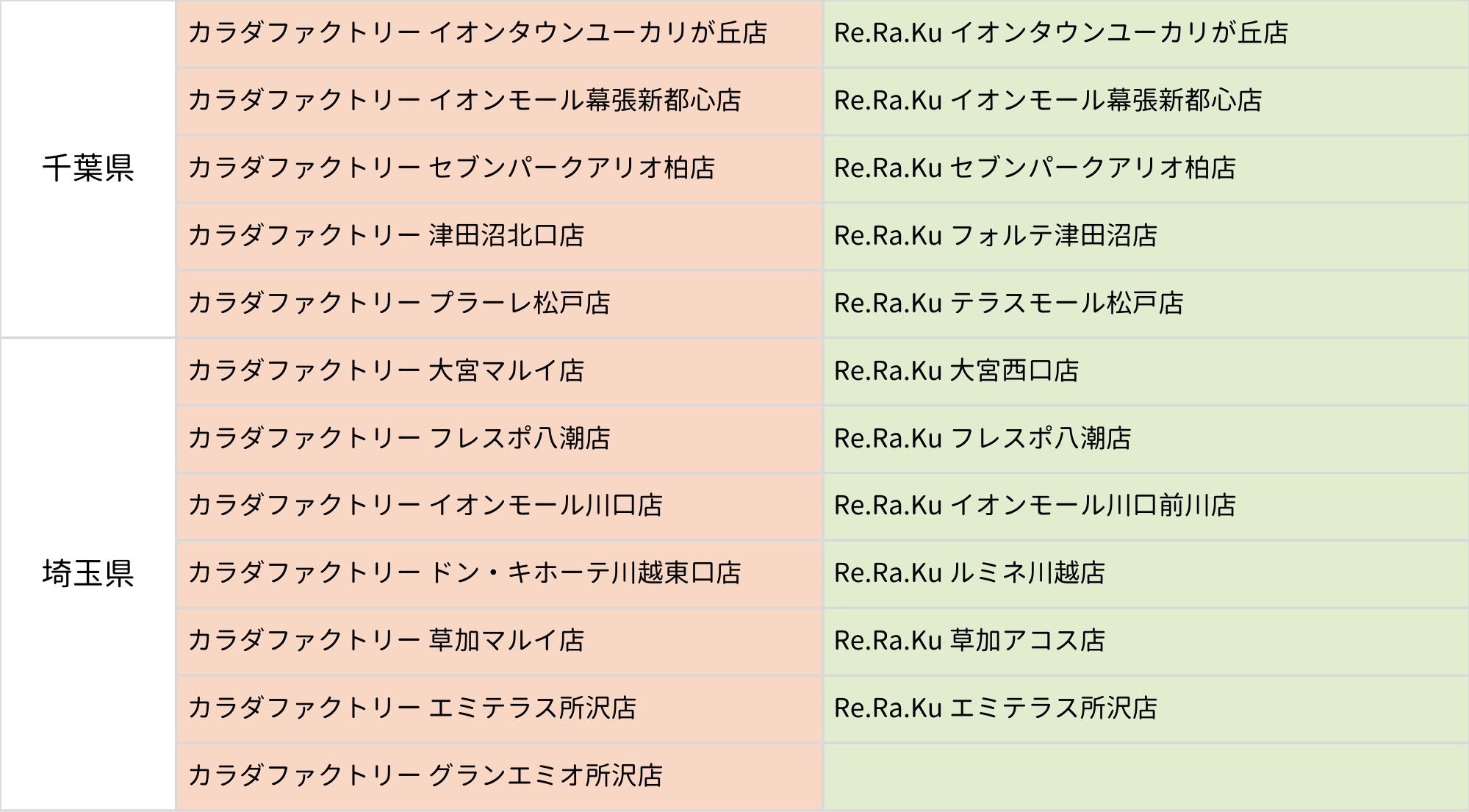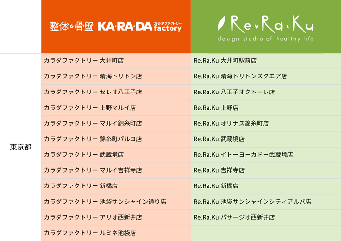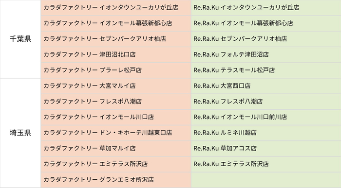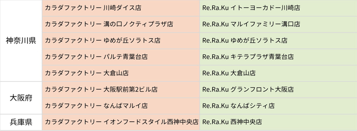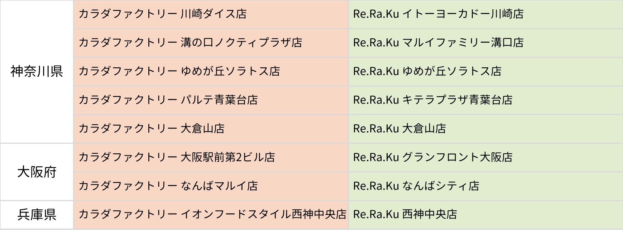対象店舗:下記、30エリア(カラダファクトリー 32店舗・Re.Ra.Ku 30店舗)