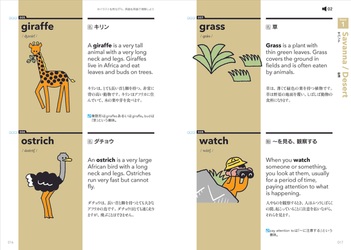 たとえば、elephant(ゾウ)という単語なら、どんなものか誰もがよく知っています。説明文にわからない単語が出てきても、すでに持っている知識やイメージから意味を推測し、無理なく理解することができます。本書では、そんな身近な単語を中心に取り上げました。