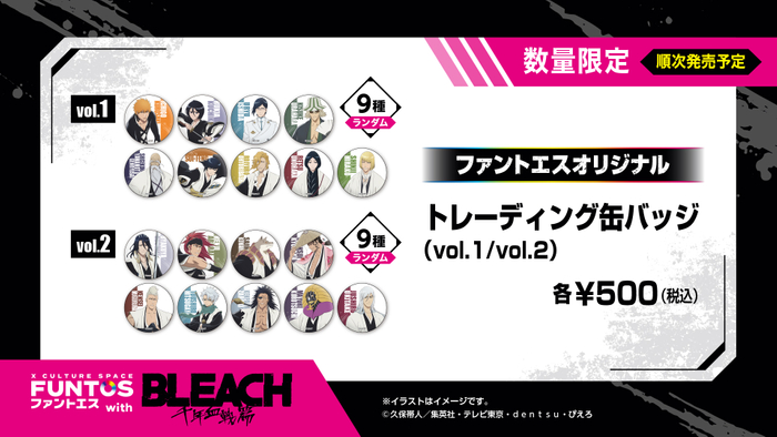 vol.1とvol.2、それぞれ9種ずつのトレーディング缶バッジです。黒崎一護、朽木ルキア、朽木白哉、阿散井恋次は描き下ろしイラストデザインとなります。