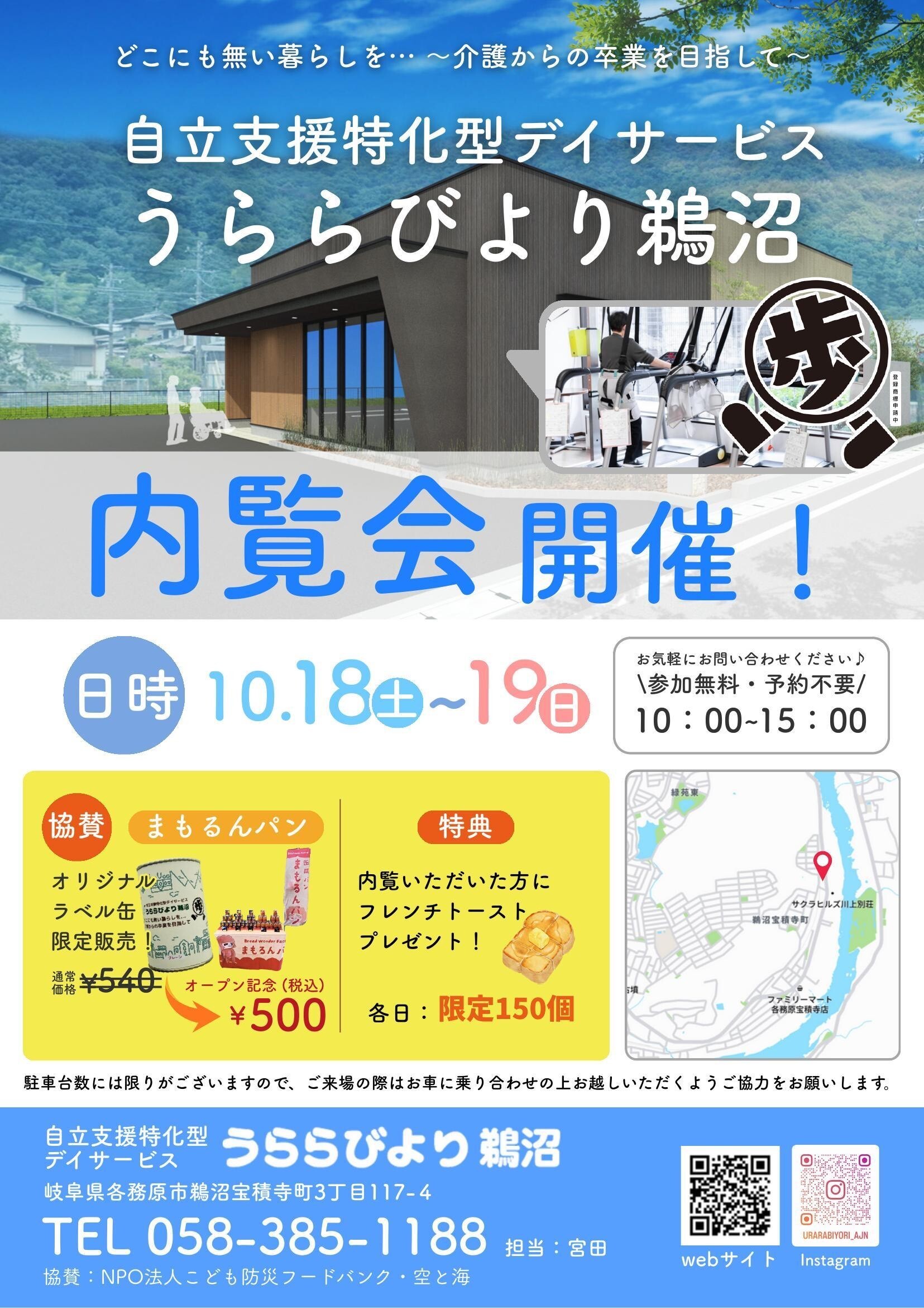 内覧会では施設の見学、最新のリハビリマシン体験、まもるんパンのご試食があります。また、うららびより鵜沼オリジナルラベルのまもるんパン販売、ご来場特典フレンチトーストプレゼント、今尾昌子さん弾き歌いコンサートなどを予定しております。