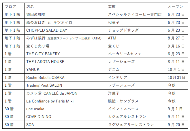 今秋までに地下1階に2店舗、1階に関西初出店などを含む6店舗、最上階の30階には新業態3店舗のオープンを予定しているほか、淀屋橋エリア最高峰の高さから梅田・中之島をはじめとした大阪の街の眺望が楽しめる「淀屋橋スカイテラス」の一般開放が9月1日(月)よりスタートします。淀屋橋ステーションワン初の物販店舗がオープンする今回も、商業ゾーンのコンセプトである「粋(すい)を尽くしたおもてなし」(粋=相手の心を慮って先回りして行動すること)のとおり、施設を訪れるみなさまに喜んでいただけるような心尽くしのハイクオリティなショップが登場し、生活を彩ります。また今後も店舗のオープンを順次予定しており、さらなるエリア・施設価値向上に貢献します。