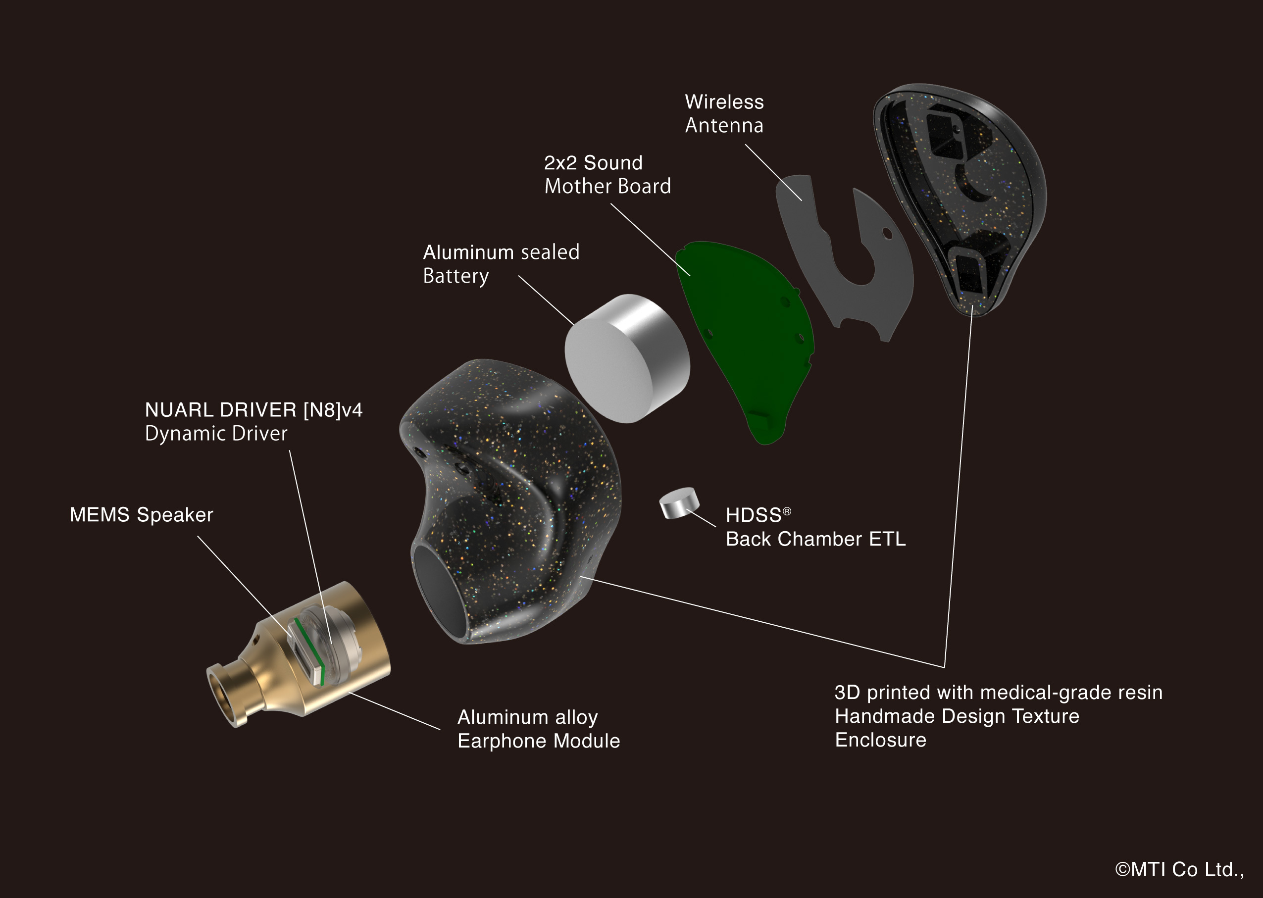様々なカスタムIEMを制作しているイヤホン筐体制作会社の耳型データベースを基にしたシミュレーションから導き出された複雑な形状の筐体は3Dプリントによって形成することで実現。筐体の素材には肌に優しい医療等級の樹脂を使用し、軽快な装着感と高い遮音性を両立しています。